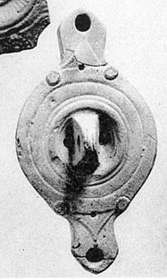 | Description: | One nozzle missing. Pierced vertical handle in center of discus. Grooves around rim; raised disk either side of nozzles; raised triangle on top of nozzles. Reverse, low base ring. Unglazed. Pale buff clay. Type XXX of Corinth collection. | |
