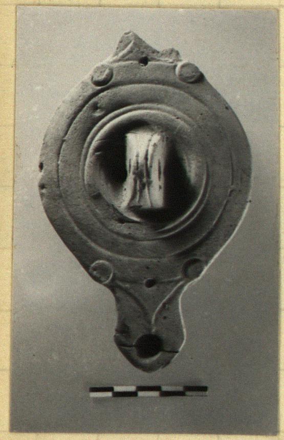 | Description: | One nozzle missing. Pierced vertical handle in center of discus. Grooves around rim; raised disk either side of nozzles; raised triangle on top of nozzles. Reverse, low base ring. Unglazed. Pale buff clay. Type XXX of Corinth collection. | |