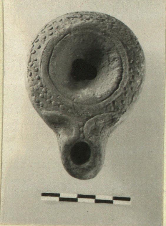 | Description: | Intact except for chip at filling hole. Typical globules on body and top; typical "alpha", incised on reverse. Dark red wash. Red clay. Type XX of Corinth collection. | |