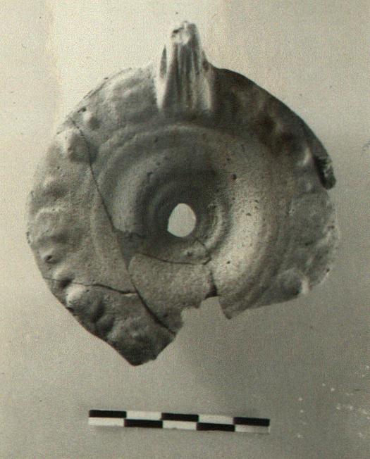 From a very worn mould. Grooved pierced handle. Reverse, concentric grooves.