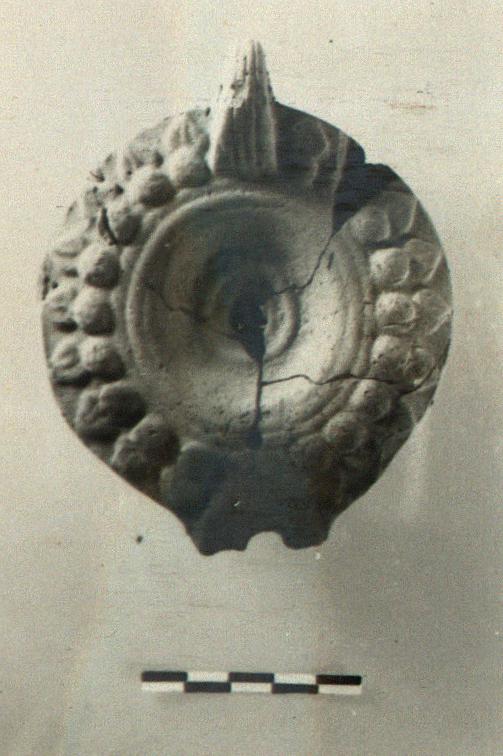 Plain discus with ridges around filling hole and outer edge; on the rim, ring of rosettes and ivy-leaves. Pierced handle; reverse, low base ring.