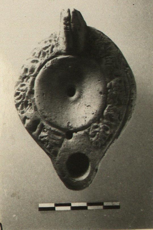 | Description: | Chip missing from handle; otherwise intact. Plain discus; vine pattern on rim. Solid handle, single-grooved below, double above. Reverse, two grooves simulating a base ring; inside it, five impressed circles. Carelessly made, the top set askew on the body. Unglazed. Coarse pinkish-buff clay. Type XXVIII of Corinth collection. | |