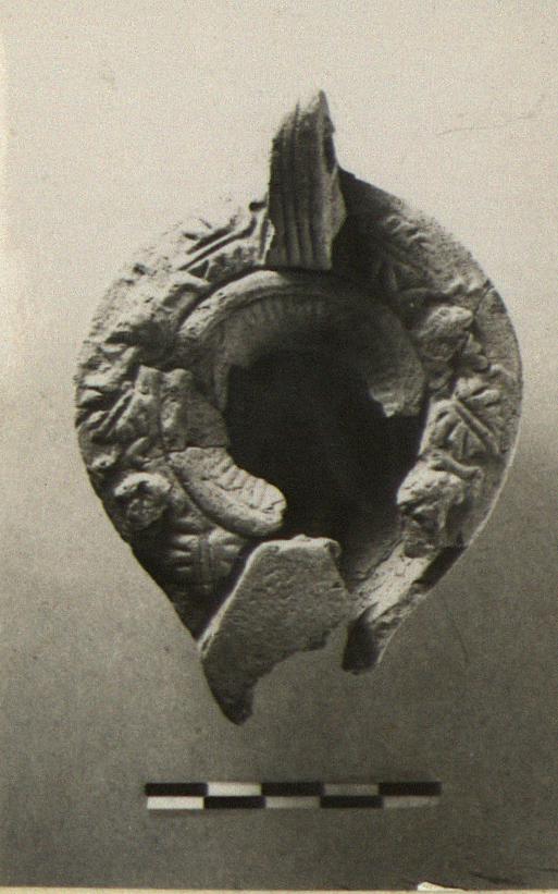 | Description: | Mended from several pieces; parts of discus, rim, nozzle and wall missing. Rim, vine pattern; discus, rays; handle, pierced; reverse, within a single groove and ivy leaf and stem outlined in relief. Pinkish-buff clay; pale buff surface. Type XXVII of Corinth collection. | |
