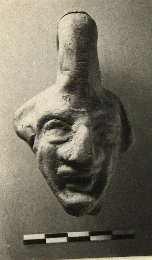 | Description: | Broken off at the neck. Hand-modelled head with pointed chin, huge hooked nose, and projecting ears. Heavy rolled handle, from forehead to crown. A few traces of white, and perhaps of red glaze. Pinkish-buff clay. ADDENDA C.G: Probably not a lamp. | |