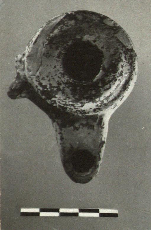 | Description: | Complete. Low base; pierced lug; no handle. Dull black glaze over all; much peeled. Type XII of Corinth collection, type 43C of Agora collection. | |