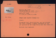 | Description: | Intact. Elongated oval object, hollow; one end pointed the other rounded; roughly flattened on top, and pierced by two large holes near the blunt end. Unglazed. Reddish clay. | |