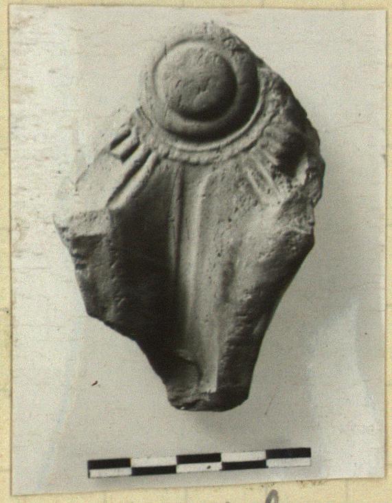 | Description: | Fragment preserves mold for top and nozzle with rays on rim. Two letters scratched on back. Type XVIII of Corinth collection, type 48A of Agora collection. <graphic> | |