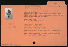 | Description: | Complete, including handle. Very broad shallow rays on rim. Bottom plain. Dull, thin glaze on top and running down on to lower half. Buff clay. Type XVIII of Corinth collection, type 52H of Agora collection. | |