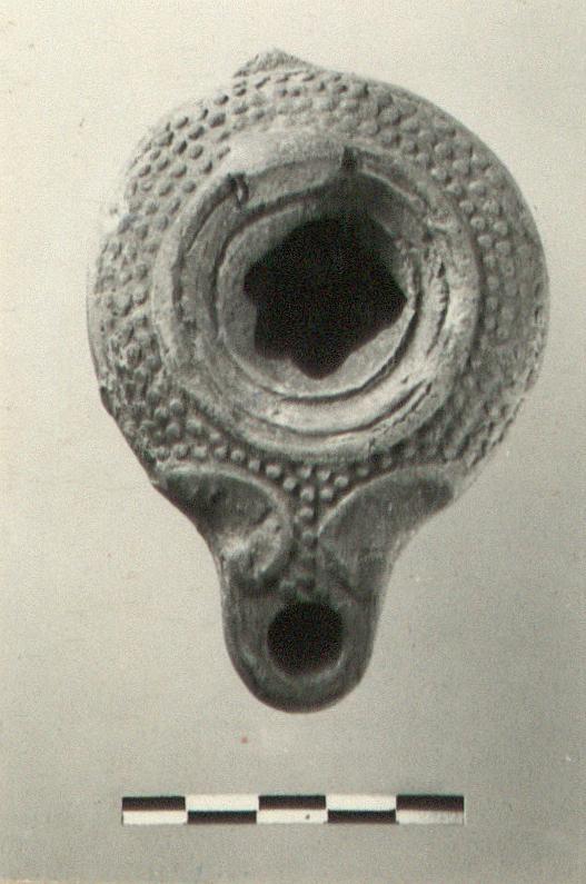 | Description: | Handle and some of discus missing. Typical globules on rim and body. On reverse "alpha", in relief. Type XX of Corinth collection. | |