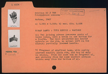 | Description: | Fragment a), two joining pieces preserve parts of three lamps with a break on the bottom for a fourth. The best preserved has double spirals on the rim, an animal left on the discus; partially pierced handle. Fragment b), fragment of misfired lamp, with partly pierced handle; plain rim, and top of ship on discus. From the same box as fragment a), and probably from the same waster: perhaps broken away from the bottom of a). | |