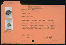 | Description: | About two thirds of the bottom preserved. Reverse, three raised ridges, the largest serving as ring foot. At center, raised circle and dot. Letters in relief around. Pale buff clay. Type XXVII Variant (?) of Corinth collection. Cf. L 710, L 4093. <graphic> | |