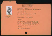 | Description: | Intact. Plain discus. Wavy lines on rim. Handle double-grooved, unpierced. Reverse almond-shaped, outlined by single groove; palm branch (?) within. Dull purplish glaze. Type XXVIII of Corinth collection. | |