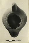 | Description: | Intact save for part of discus missing. Plain rim; groove around discus. Unpierced handle, triple-grooved above. On the reverse, four concentric circles. Dull light brown glaze, partly worn off. Darker brown clay. Type XXVIII of Corinth collection. | |