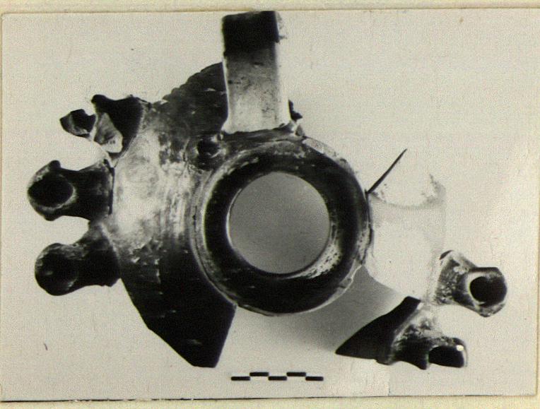 | Description: | Part of the upper body, the concave rim, the vertical band handle, and eight nozzles. Several fragments do not join. High domed top, with rim inset; lugs at either side of the upper handle attachment. Short fluked nozzles, set around the point of greatest diameter. Somewhat metallic black glaze inside and out. Type 34B of Agora collection. | |