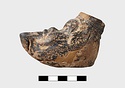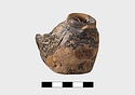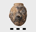 In form of grotesque head with mouth for nozzle. Large filling hole on top of head. Part of pierced lug on left side and points of attachment for handle at back.