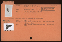 | Description: | Fragment from left side of nozzle of large lamp. On nozzle, large wick hole; at the left, one end of a large volute. Glaze dark silvery gray, thick and good. Gray clay. Type XXI of Corinth collection. | |
