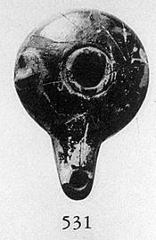 | Description: | Mended from many pieces; complete except for tip of nozzle and small chips. Ring base, groove around filling hole, large pierced lug at left side. Incised on upper face of nozzle. Black glazed over all. Grayish clay. Type IX of Corinth collection, type 42B of Agora collection. | |