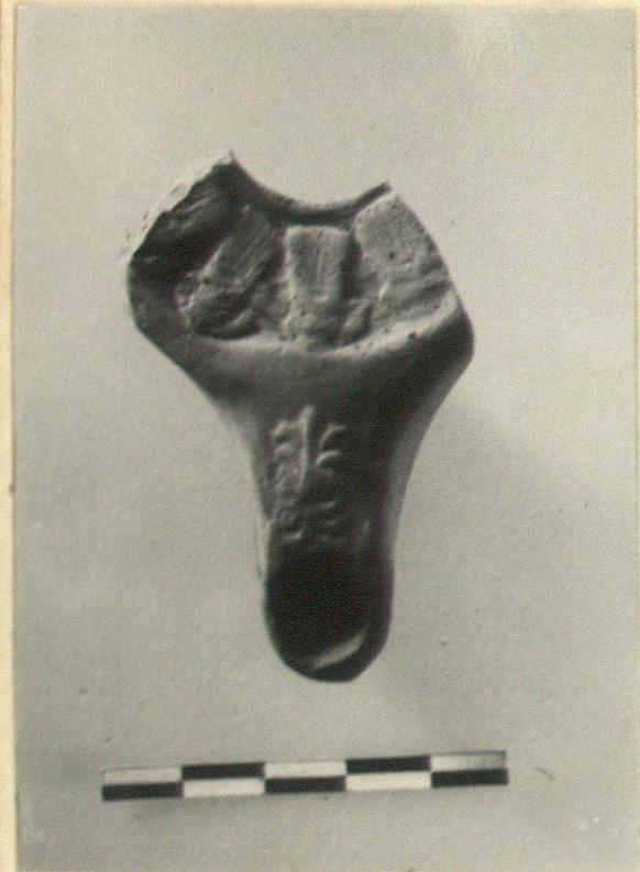 On bridge of nozzle is a double palmette in relief. On rim are saryr masks in relief, with long square beards: Megarian bowl motif.