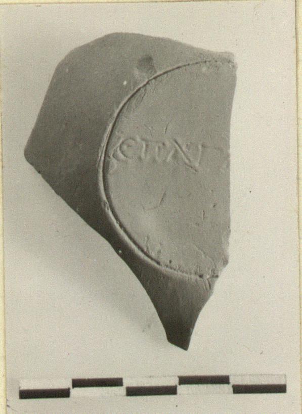 | Description: | Fragment of base. Stamped. Signature within single groove. Thin fabric; red clay. Type XXVII of Corinth collection. ADDENDA On 20th May 1955, piece sawed off wall and sent to British Museum Laboratories. <graphic> | |