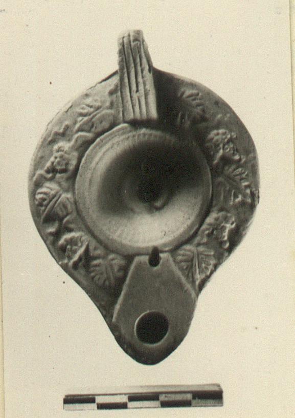 | Description: | Intact except for small hole in side; minor chips. Cracked. Rays on discus; grapes on rim; ivy leaf on underside; grooves on handle. End of nozzle burned. Pale buff clay. Type XXVII of Corinth collection. | |