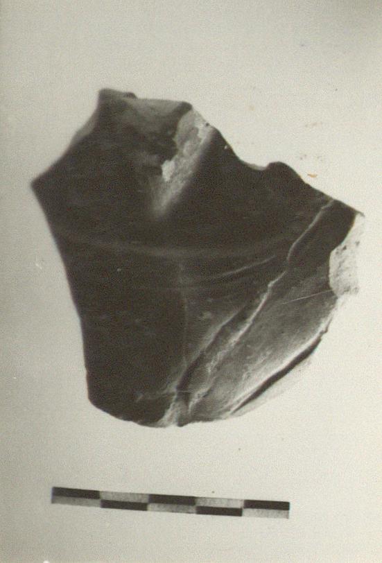 | Description: | Single piece from rim and disk of large lamp. Part of high relief on discus pierced-perhaps a pointed cap (?), boukranion (?). Broad slightly downturned rim, bordered at both edges by a groove. Remains of a filling-hole with two channels at break on pointed object. Brown to tan glaze on outside. Pinkish-buff clay. | |