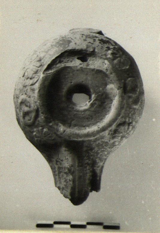 | Description: | Handle with part of rim and end of nozzle missing; hole in bottom; minor chips. Alternating rosette and ivy leaf pattern on rim; collar around flat top. Deep body. Nozzle burned. Glaze chipped from red to black. Type XVIII (post-Sullan) of Corinth collection, type 58A of Agora collection. ADDENDA From the same mold as L 2934. | |