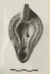 | Description: | Mended from two pieces; intact apart from small pieces chipped from rim and handle and hole in bottom; minor chips elsewhere. Herringbone pattern on rim. Raised handle, not pierced; four holes on discus. Faint cross on discus. Almond-shaped reverse. Unglazed. Burned at nozzle and hanlde. Pink clay. Type XXVIII of Corinth collection. | |