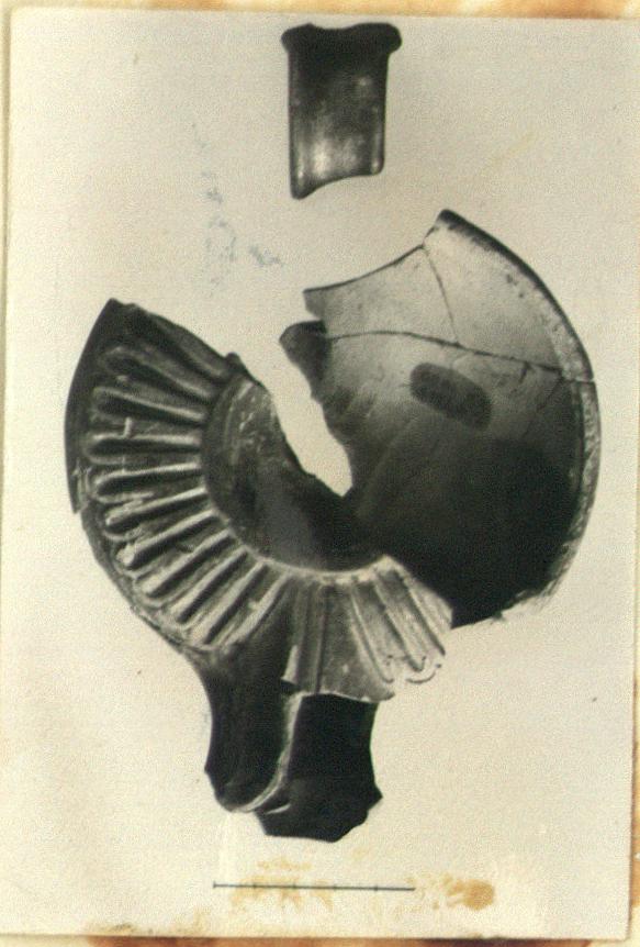 | Description: | Four non-joining fragments of a large black glazed lamp. Plain discus; tongues on rim; ring base; band handle slightly concave above. On the bottom signature in relief letters. Fragmentary. Glazed all over outside and partly inside. Glaze somewhat metallic. Type XVIII of Corinth collection, type 52C of Agora collection. ADDENDA Joining fragments added from sherds; about half of top part, part of back, with attachments for handle, and end of nozzle missing. The handle fragment does not join. H. 0.058; W. 0.12; P.L. 0.148. | |