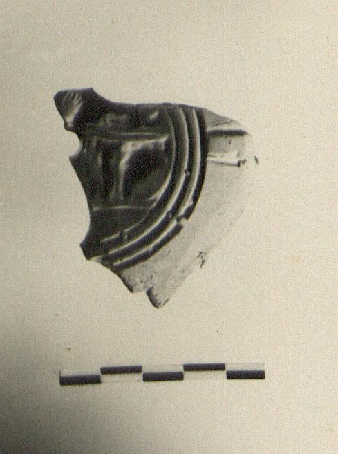 | Description: | Part of discus and rim preserved. Discus: a person seated right at a round table with offerings. Rim, plain, with panels. Unglazed. Buff clay. Type XXVII of Corinth collection. Cf. L 4780 (Σ 1456) for similar subject. | |