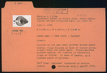 Nodules on rim and body; grooves around plain discus; false volutes at base of nozzle above; ridges round its lower part. Triple-grooved pierced handle; dot rosette in concentric rings on bottom. At base of handle, an "X" between pairs of grooves.