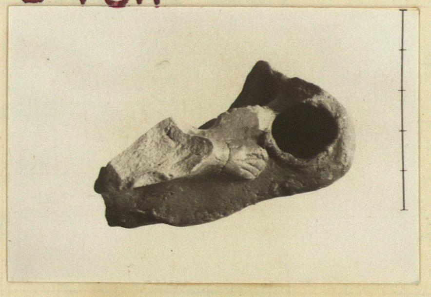 | Description: | Left side of front part of body with nozzle preserved. On top right foot of draped plastic figure. Red glaze outside, and around nozzle inside. Light cinnamon clay. | |