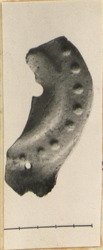| Description: | Four joining fragments and one non-joining preserve half of the body and half of top. Deep body with small base; oval top; rim decorated with raised dots; discus plain; one hole pierced in discus, a smaller one in rim. Unglazed. Hard, buff micaceous clay. ADDENDA JP, 22 July 1955: This lamp belongs to the upper fill. | |