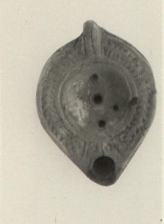 | Description: | On rim, herringbone. Plain discus, with central filling hole and three auxiliary smaller holes, surrounded by groove. Nozzle set off by grooves, between which are two impressed circles separated by a groove. Handle solid, double grooved; set off by groove from body. On bottom, impressed circles at base of handle; double almond-shaped groove enclosing the letters: "ΠΟ". Unglazed. Traces of wash (?). Soft red clay. Type XXVIII of Corinth collection. | |
