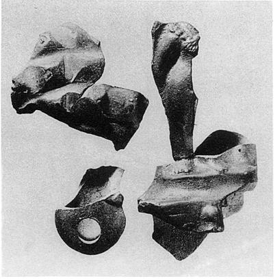 | Description: | Nine joining and non-joining fragments. On a cubical base, the front of which was adorned with figures in relief, the tip of a cap of Attis (?) is all that remains, stands a nude figure of Eros (?) of which only the lower right side of the body is preserved. Several fragments seem to represent bits of a rocky landscape, perhaps a background against which the figure leaned. Since one fragment, which must represent the bottom edge of the base shows that there was no bottom to the base, it is uncertain in what part of the lamp-figure was attached the nozzle. The nozzle fragment preserved is rounded at the tip and had volutes at the sides. Reddish-brown glaze with metallic lustre. Brownish clay. Cf. L 708. Cf. BMC Lamps, no. 409. | |