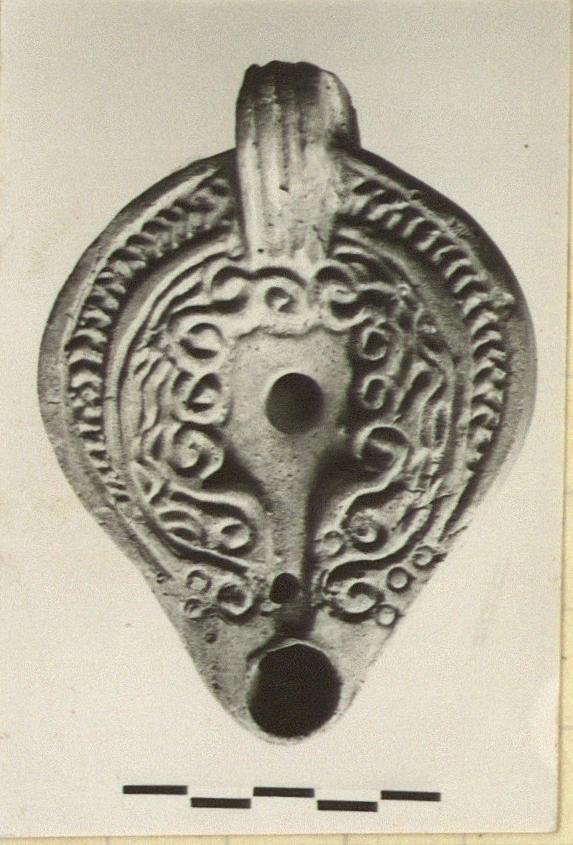 | Description: | Handle chipped, otherwise intact. Square discus surrounded by wave pattern. Rim, herringbone. Solid handle, grooved. On bottom in a leaf framed by a double groove, a branch and the letters "KY". Dark red glaze. Orange clay. Type XXVIII of Corinth collection. | |