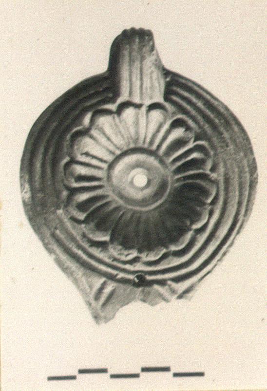 | Description: | Nozzle missing, and center of reverse. Rosette in discus. Grooved rim. Handle, three grooves above, two below; unpierced. Reverse, heart-shaped design with circles. Brownish clay; burned. Type XXVIII of Corinth collection. | |