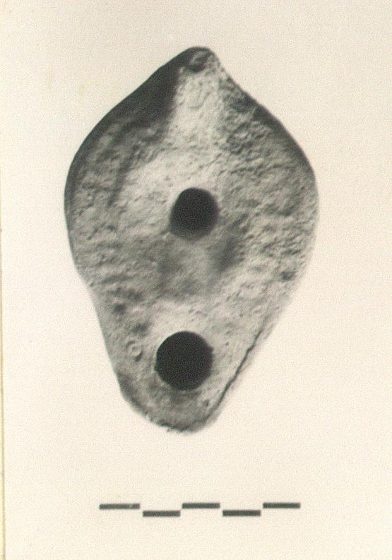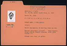 | Description: | Intact. Faint impression of herringbone on rim. Discus uncertain (cross?). Knob handle. Large almond-shaped reverse, with palm branch (?). No glaze. Orange-red clay. Type XXVIII of Corinth collection. | |