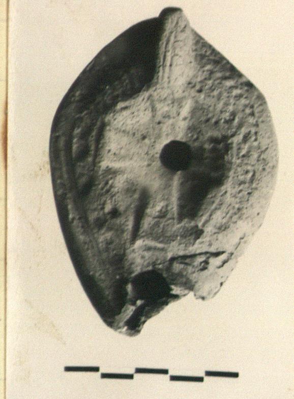 | Description: | Tip of nozzle missing. Late variety with large almond-shaped reverse. Very poor impression; herringbone on rim, cross on discus; bottom apparently plain. Pointed knob handle. No glaze. Light red-brown clay. Type XXVIII of Corinth collection. | |