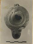 | Description: | Handle missing, and chips from discus. Grooved handle, made separately. Raised "alpha" within two rings beneath. Red to brown glaze. Red-brown clay. Type XX of Corinth collection. | |