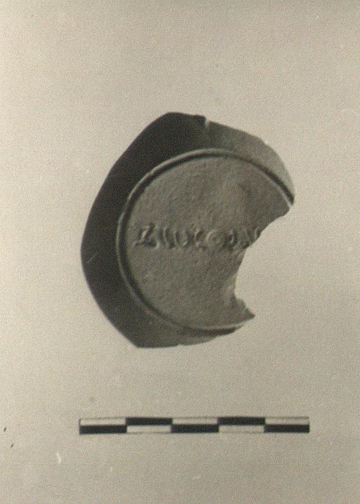 | Description: | Fragment of reverse of lamp. Signature within grooved circle, incised. Light pinkish-buff clay. Type XXVII of Corinth collection. <graphic> | |