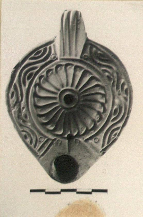 | Description: | Intact. Rosette on discus, wave pattern on rim; solid handle triple grooved above and below. Incised letter on bottom, inside two circles: "T". No glaze. Light brown clay. Type XXVIII of Corinth collection. | |