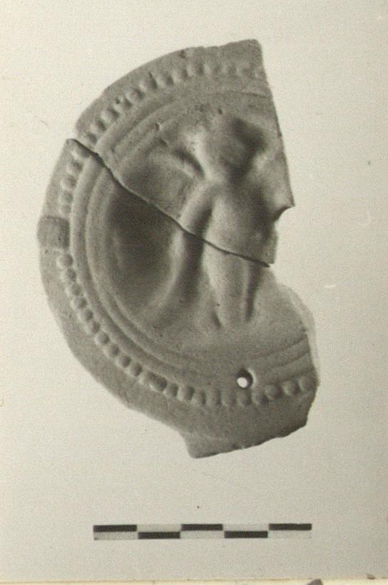 | Description: | About two thirds of rim and discus preserved. Rim, raised dots, with panels at sides. Discus, Eros, winged, facing, holding torch turned down at his right. Unglazed. Soft gray-buff clay. Type XXVII of Corinth collection. Cf. L 3551. | |