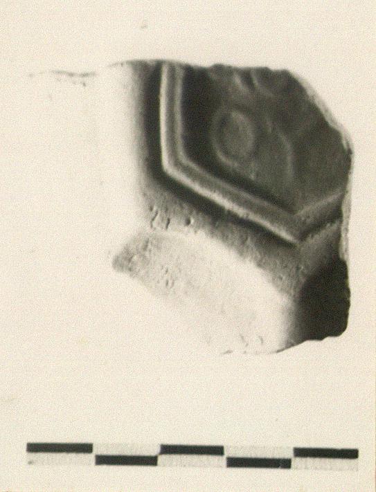 | Description: | Fragment of a moulded base of hexagonal form with part of relief signature preserved. Probably from a two-nozzled lamp. Unglazed. Soft pinkish clay with buff slip. Type XXVII (?) of Corinth collection. Cf. L 636. <graphic> | |