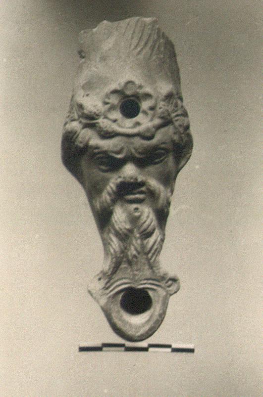 | Description: | Handle and bit of volute by nozzle missing; otherwise intact, except for chips. Flat-bottomed boat-shaped lamp, with a bearded head, elaborately wreathed, forming the upper part. Filling hole at center of forehead, surrounded by a rosette; above, the hair rises in a flame-like effect to form the handle. Fluked nozzle projecting below beard. Double grooves around the oval underside. Thin orange-red glaze. Orange-buff clay. | |