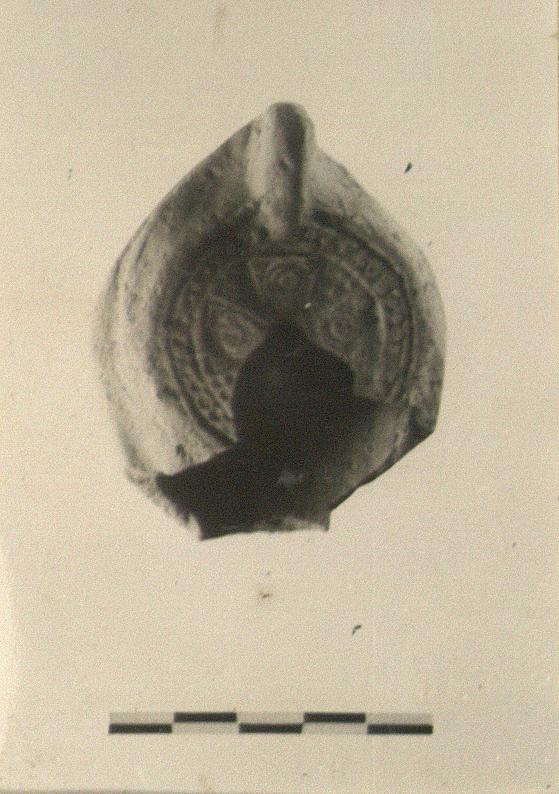 | Description: | Nozzle and about one third of lamp missing. On discus, jewelled cross with dots between, all in circle of dots. Shallow ridge around bottom with depression in center. Light red-brown clay, light yellow-buff at surface. Type XXXI of Corinth collection. | |