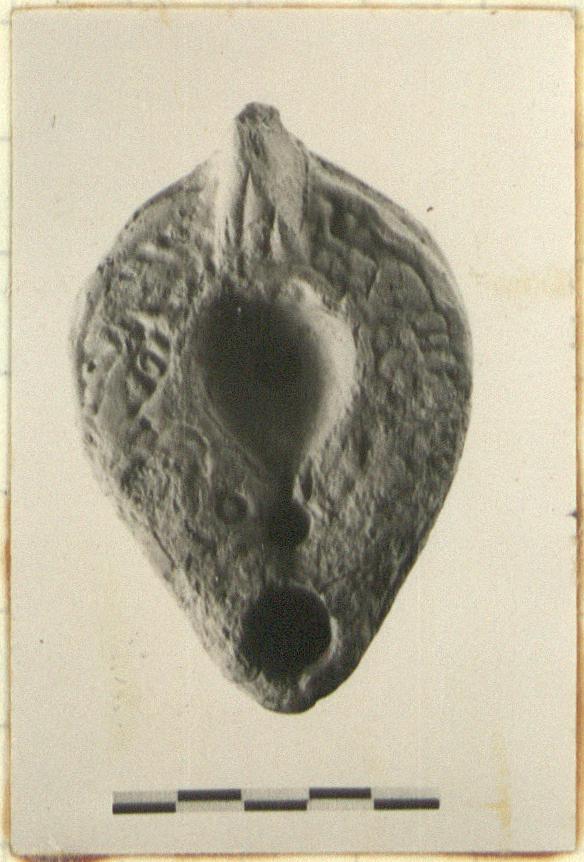 | Description: | Intact save for chip missing from lip of handle. Faint impression of wreath on rim; discus plain. Palm leaf on bottom. Solid handle, grooved above and below. No glaze. Reddish-brown clay. Type XXVIII of Corinth collection. | |