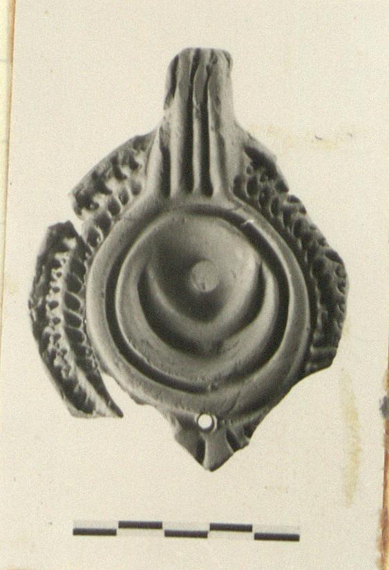 | Description: | Three joining fragments preserve handle, discus, and most of rim. Fragmentary. On rim, herringbone; on discus, half moon. Two grooves on almond-shaped bottom. Solid handle triple-grooved above, double below. Orange-buff clay. Type XXVIII of Corinth collection. | |