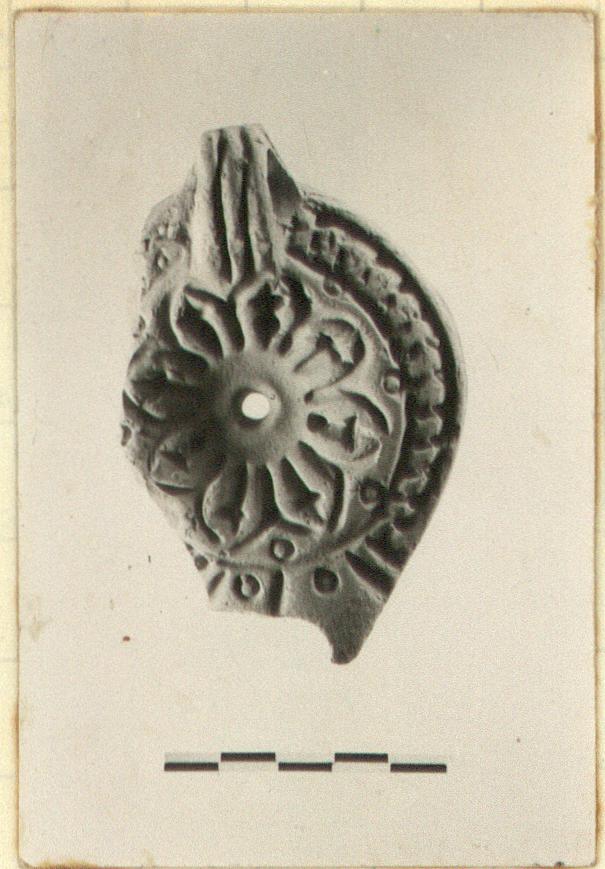 | Description: | Discus, handle and half of rim preserved. On rim, herringbone. On discus, rosette with pointed petals. Handle pierced; triple-grooved above, double below. No glaze. Brownish-buff clay. Type XXVIII of Corinth collection. | |