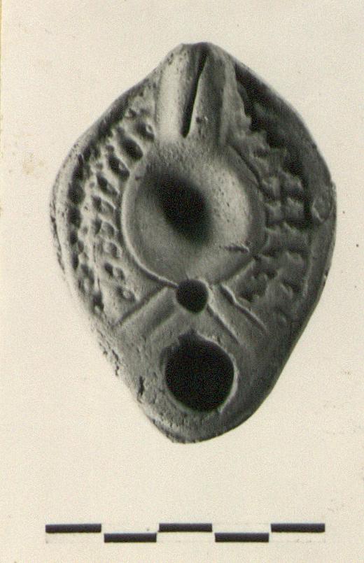 | Description: | Intact. Discus plain, herringbone on rim. Solid handle, single groove. No glaze. Yellow-buff clay. Type XXVIII (very late) of Corinth collection. <graphic> | |