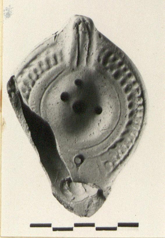 | Description: | Nozzle and chip from one side missing. Plain discus; herringbone on rim. Cross on bottom. Solid handle, double grooved above. No glaze. Gritty orange-red clay. Type XXVIII of Corinth collection. | |